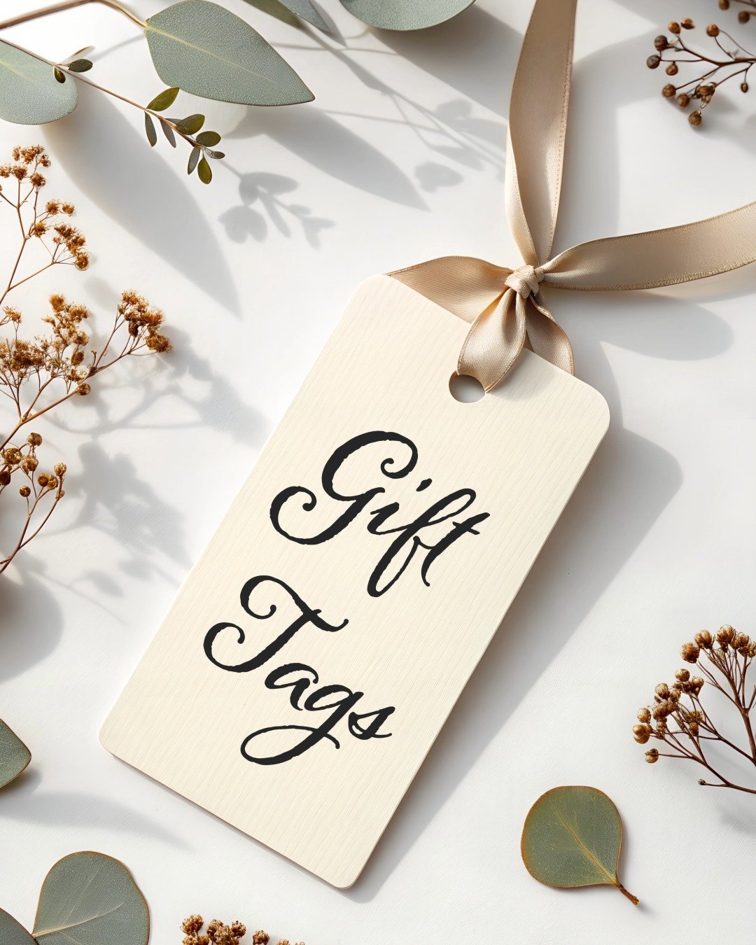 Gift bags, boxes, tags, couple illustrations, banners, wedding newspapers, and
